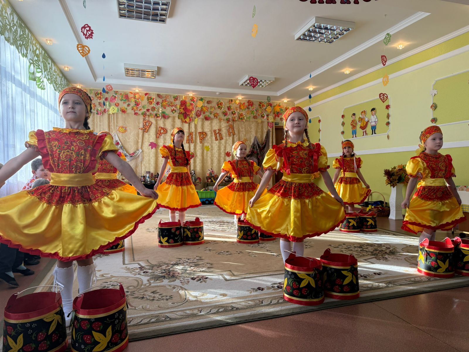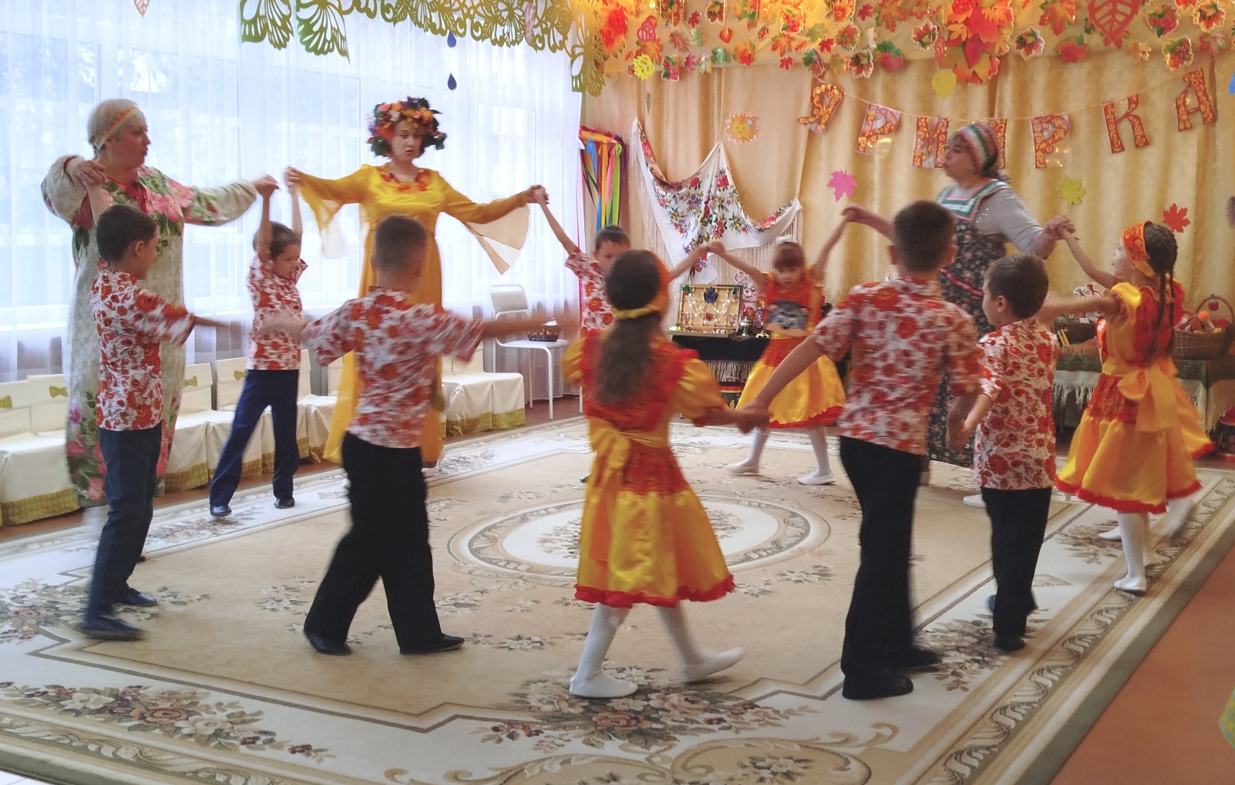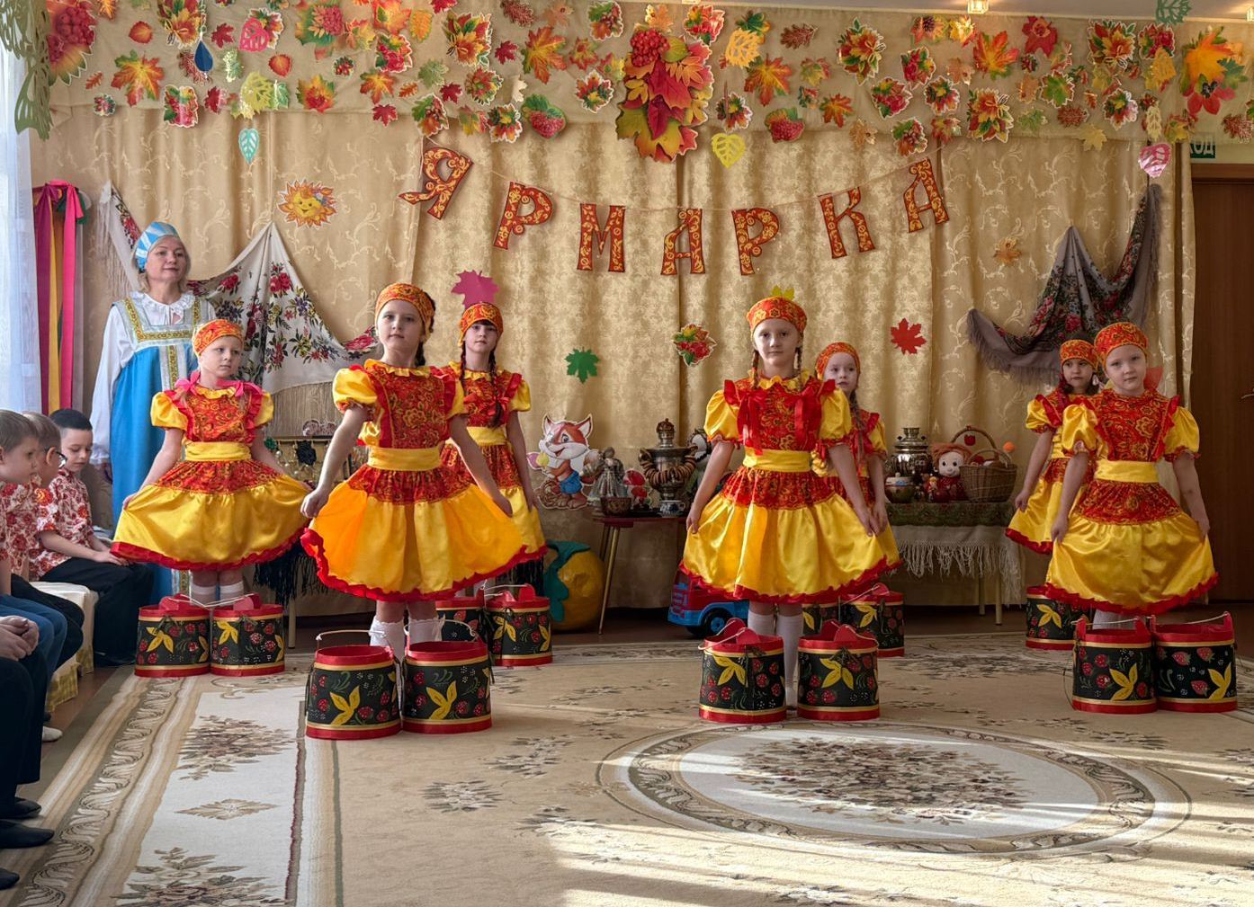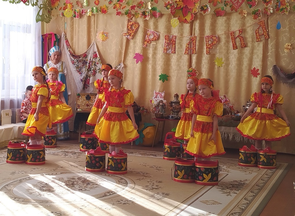 Воспитанники подготовительных к школе групп много интересного и удивительного повстречали на осенней ярмарке: «катались» на карусели, исполняли песни об осени и играли в народные хороводные игры. Никого не оставили равнодушным «продавцы» товаров и оркестр народных инструментов. Родители воспитанников, с большим удовольствием приняли участие в играх. Какая же ярмарка без гостинцев?! Все дети получили подарки от Осени.